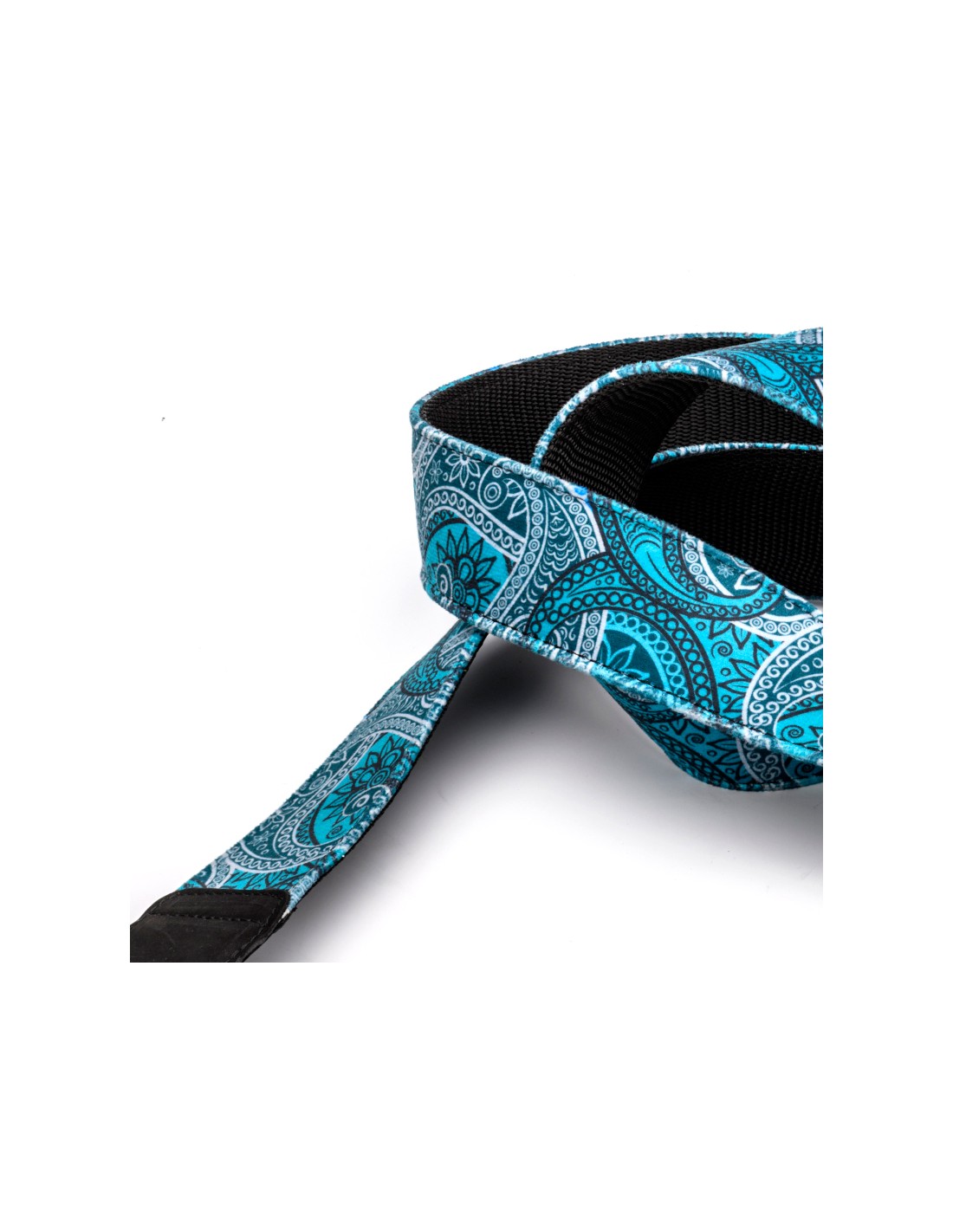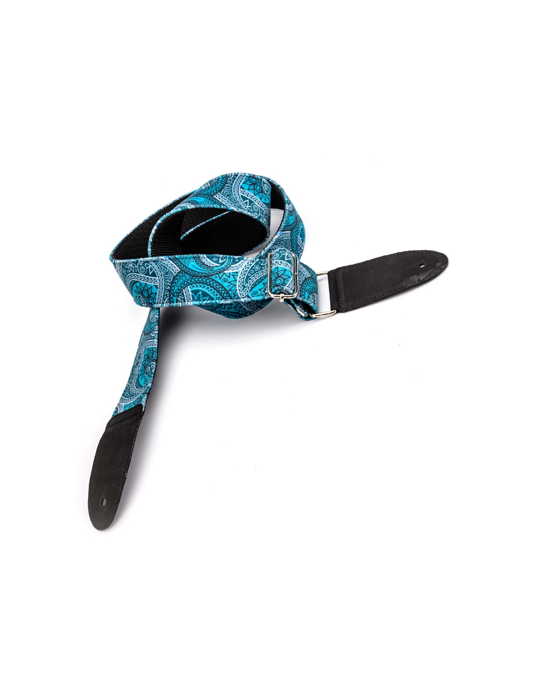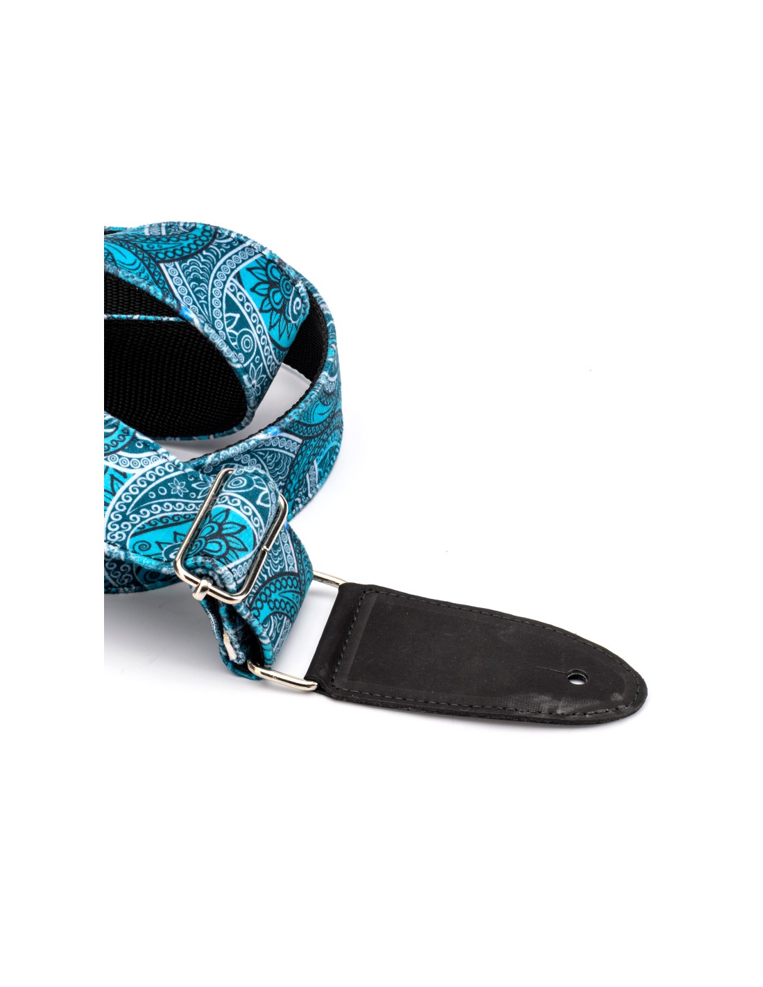 Strap for guitar or bass made of velvet textile, inside lining reinforced with nylon thread. Double leather endings with metallic buckles. Completely handmade in Spain.