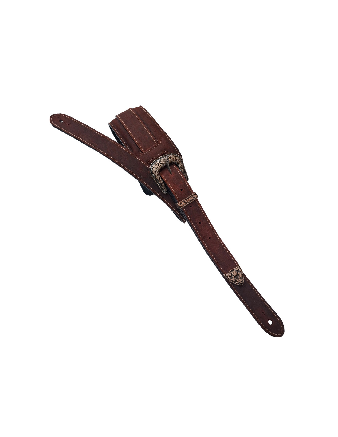 Strap for guitar or bass made with high quality bovine leather, inside lining also made of leather. Metallic ornaments and sewn details. Cushioned for the best comfort. Completely handmade in Spain.