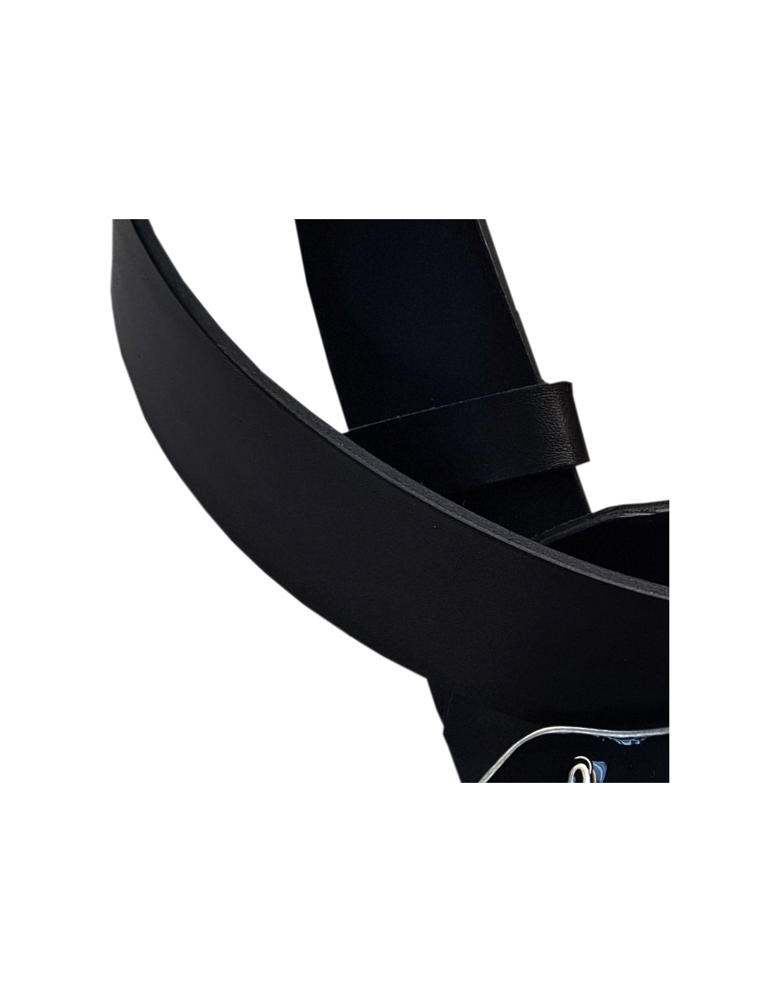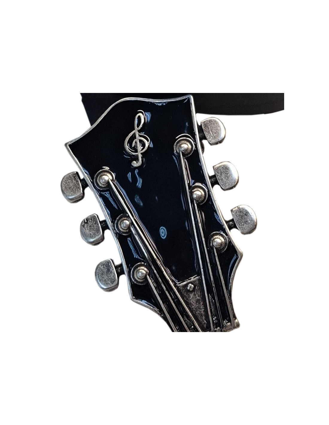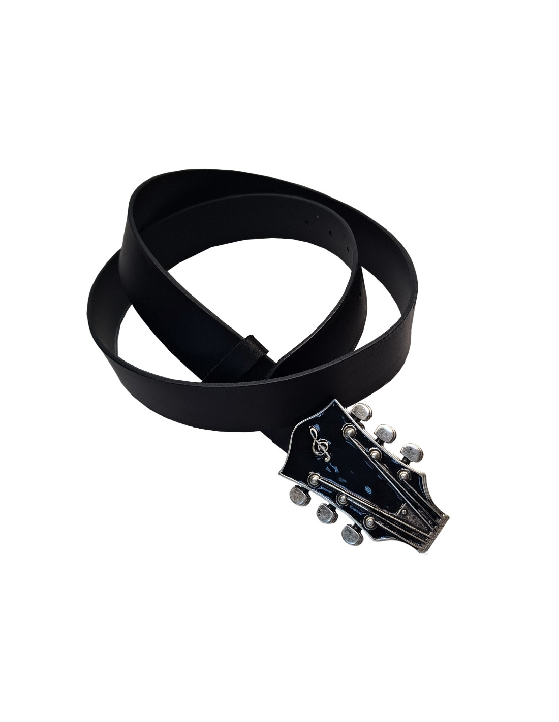 Nuevo modelo de la colección de cinturones de Bourbon Strap Guitar. El modelo guitar "headstock" belt cuenta con una hebilla completamente metálica en acabado negro del clavijero de una guitarra eléctrica, más en concreto, una réplica de la típica cabecera de una Gibson. Realizada en cuero 100% de color negro y realizada completamente a mano.
