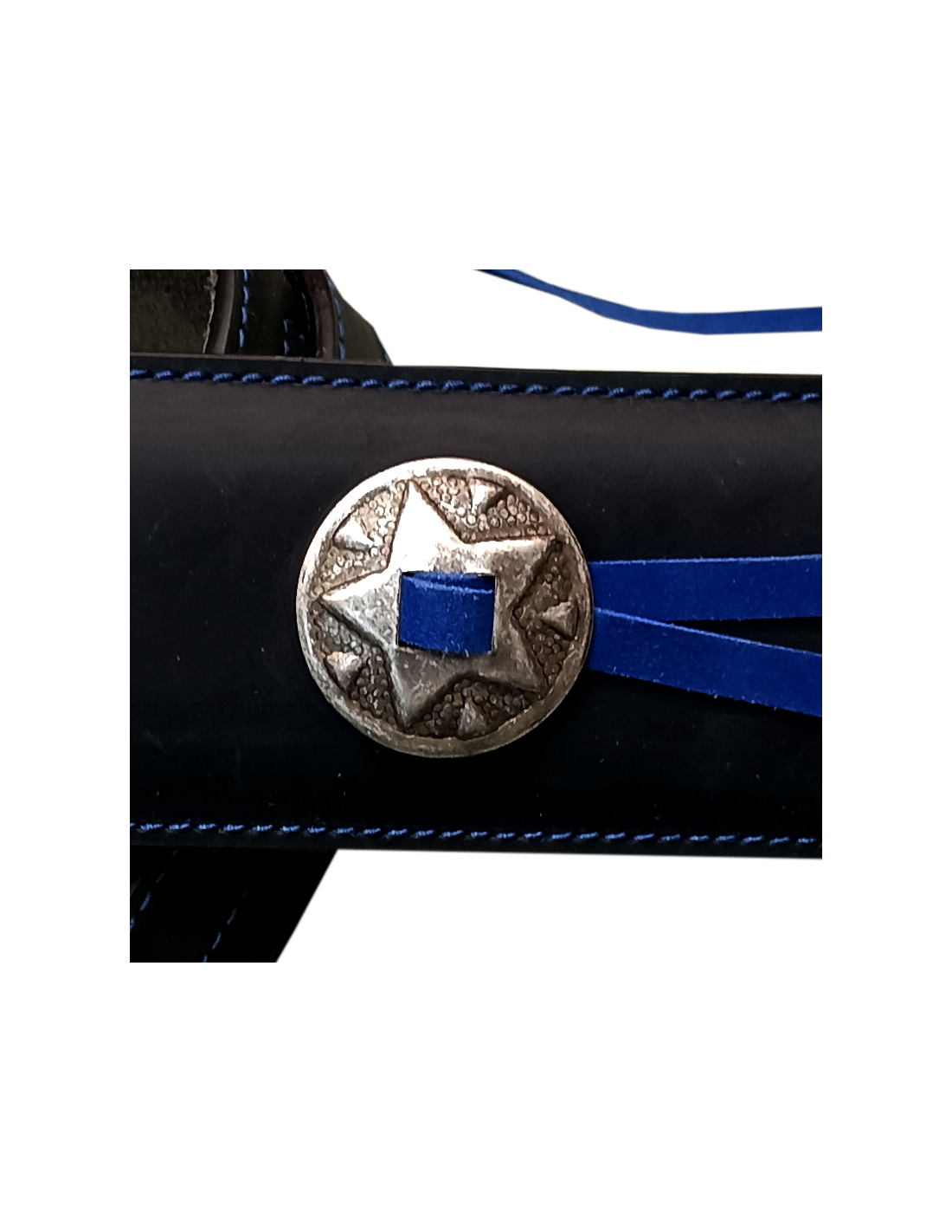 Correa de guitarra artesanal Missouri: Elegante y resistente, confeccionada a mano con cuero de alta calidad. Su diseño único garantiza comodidad y estilo con sus bonitos adornos plateados y cuero azul tintado realzando el estilo de tu instrumento musical. ¡Haz que tu pasión por la guitarra destaque con esta obra maestra!